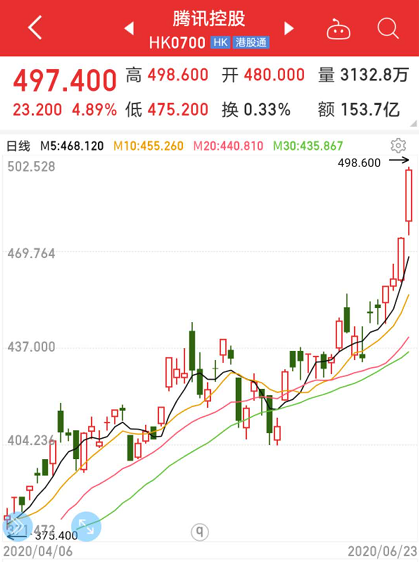 今日港股腾讯控股涨4.89%,最新市值达到4.752万亿港元,刷新历史纪录,今日一天总市值增加逾百亿元人民币。