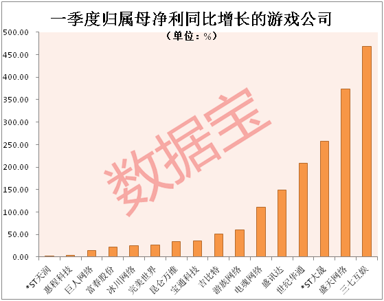 从上市公司一季度业绩看,逾8成公司归母净利润实现盈利,不过只有一半公司业绩同比去年出现增长,同比增幅居前的公司有盛天网络、*ST大晟、世纪华通和盛讯达,一季度归母净利润同比增幅均在200%以上。一季度归母净利润同比出现增长的16家游戏公司,年内平均涨幅超30%,其中*ST大晟、*ST天润和巨人网络年内股价出现下跌。