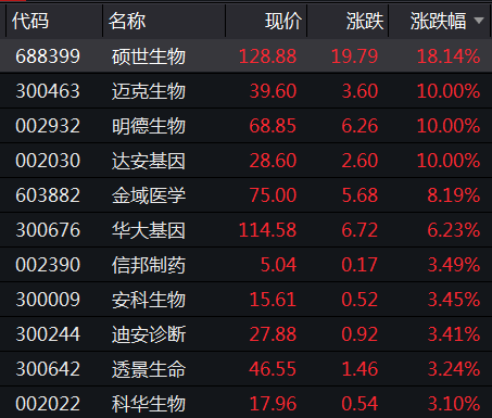 新冠检测板块今日盘中走势强劲,截至收盘,硕世生物(科创板)大涨逾18%,迈克生物、明德生物、达安基因等涨停,金域医学涨逾8%,华大基因涨逾6%。