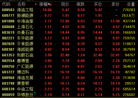 石油板块今日盘中震荡上扬,截至收盘,海油工程、新潮能源涨停,中海油服、上海石化、中曼石油等涨幅超7%,东华能源涨逾5%。