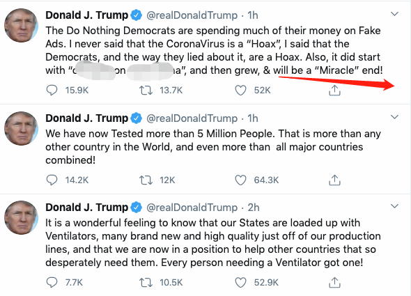 特朗普周六连发多条推文,除了继续猛烈抨击民主党人外,他还抨击了媒体发布的“假新闻”。特朗普还在推特上表示美国进行的新冠检验比世界上大部分发达国家都多,还表示联邦政府为各州提供了充足的呼吸机。特朗普在推特上写道,“无所事事的民主党人花了很多钱在虚假广告上。我从来没有说过新冠病毒是一个骗局,我是说民主党人,他们针对疫情撒的谎是一个骗局。新冠疫情未来将会有一个“奇迹般”的结束!”