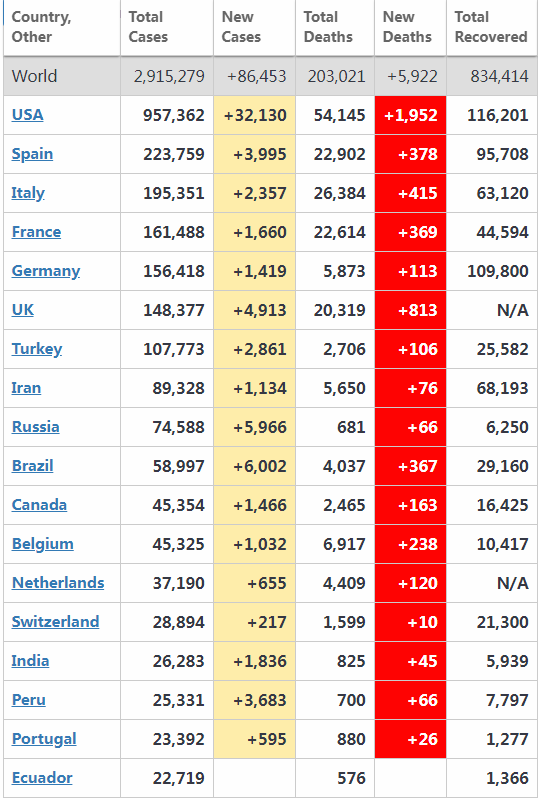 据Worldometers全球实时统计数据,截至格林威治时间4月25日23:16 ,全球确诊新冠肺炎病例291.52万例,死亡20.3万例,其中美国确诊95.73万,死亡5.4万例。根据世界卫生组织数据显示,欧洲中部夏令时4月24日10时至4月25日10时(北京时间4月24日16时至4月25日16时),全球确诊新冠肺炎病例新增93716例。这是自1月21日世卫组织开始发布新冠肺炎每日疫情报告以来,日新增病例的最高值。此前的最高值是4月11日报告的新增89657例。