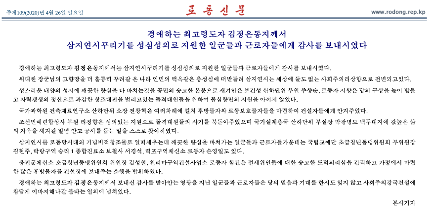 据央视新闻援引朝鲜劳动党机关报《劳动新闻》26日报道,朝鲜最高领导人金正恩向支援三池渊建设的工作人员表示感谢。收到来自金正恩的谢意,当地工作人员感到无比光荣,表示将以更高的热情投入建设工作。2019年12月,朝鲜将三池渊郡改为三池渊市,并积极推进三池渊市工程建设。