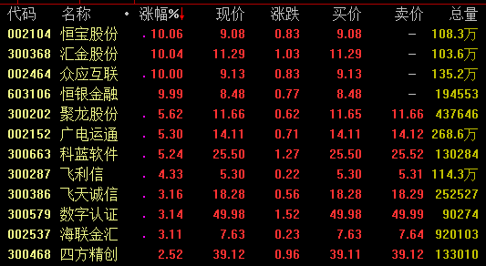 数字货币概念午后快速拉升走高,截至发稿,恒宝股份、汇金股份、众应互联、恒银金融等涨停,聚龙股份、广电运通、科蓝软件等涨停。