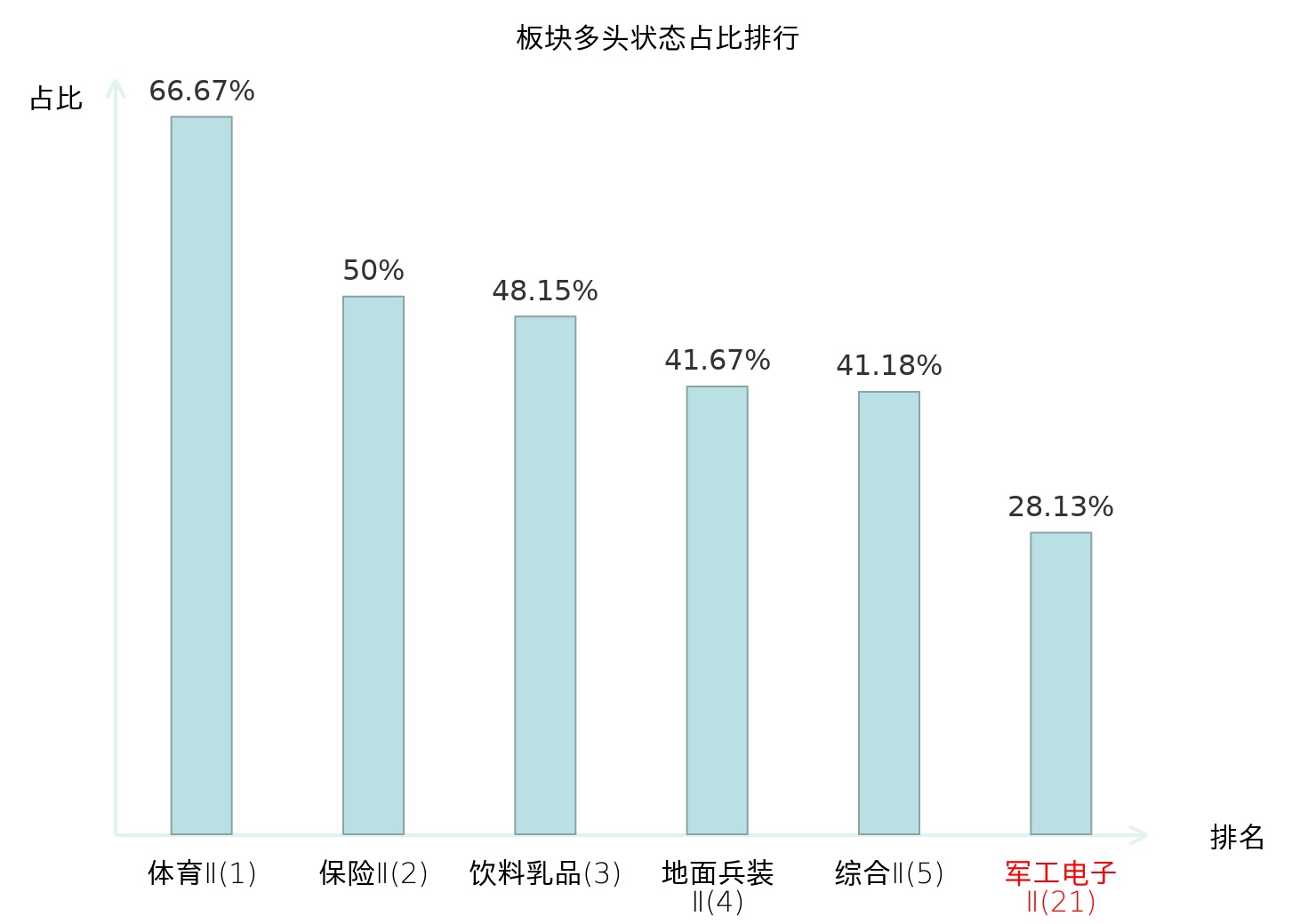 全市场所有行业板块中主力多头状态占比排名中,体育Ⅱ板块位居第一。种植业板块名次提升最快,较昨日上升70位。