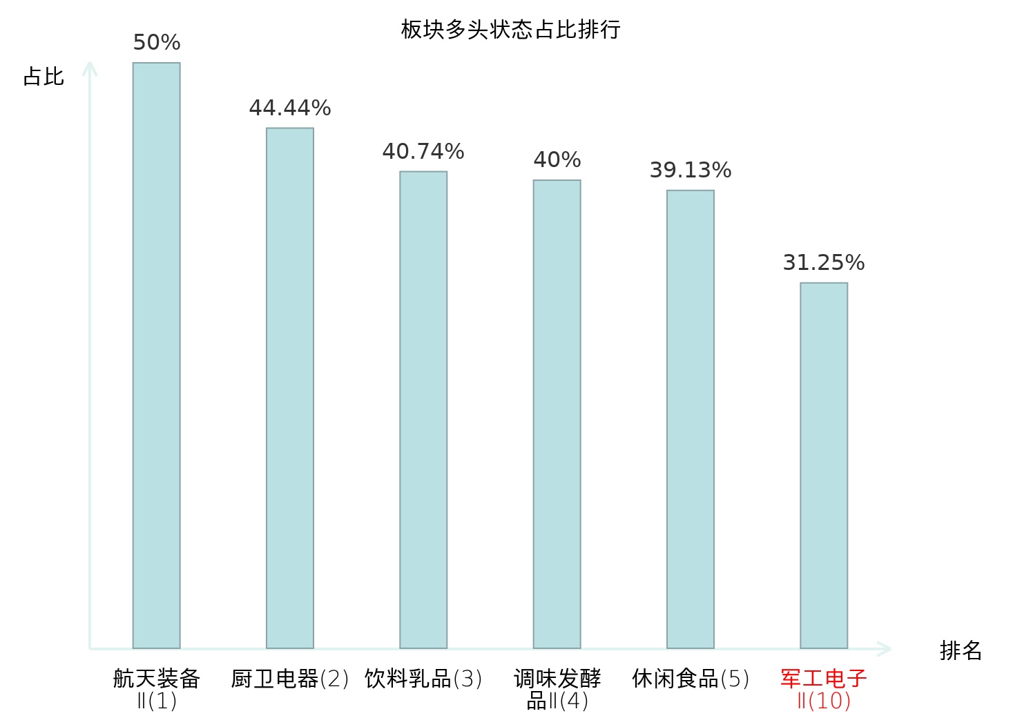 全市场所有行业板块中主力多头状态占比排名中,航天装备Ⅱ板块位居第一。林业Ⅱ板块名次提升最快,较昨日上升92位。