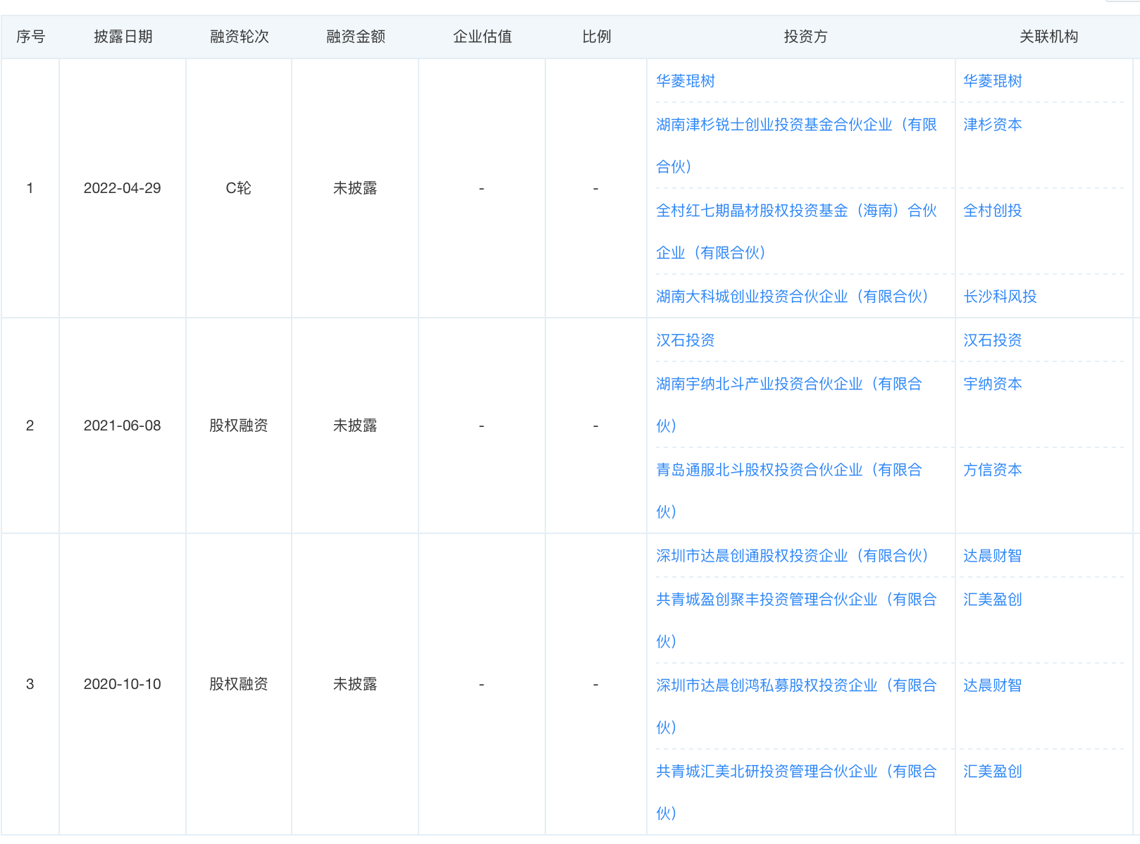 截至目前,北斗院共历经3轮融资。2020年10月完成的首轮融资中,达晨财智、汇美盈创参投;2022年4月完成的C轮即最新轮融资中,华菱琨树、津杉资本、全村创投、长沙科风投参投。