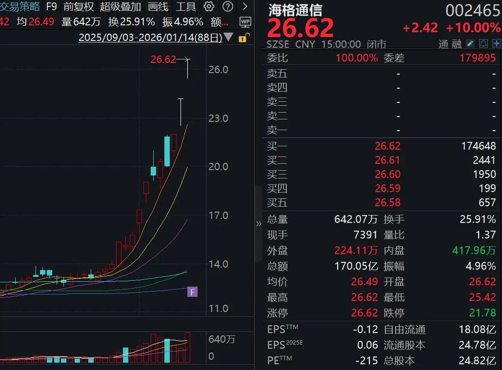 海格通信是近期市场上的另一只牛股。2025年12月24日至2026年1月14日,海格通信累计涨幅超过100%,1月14日,其股价再次涨停。