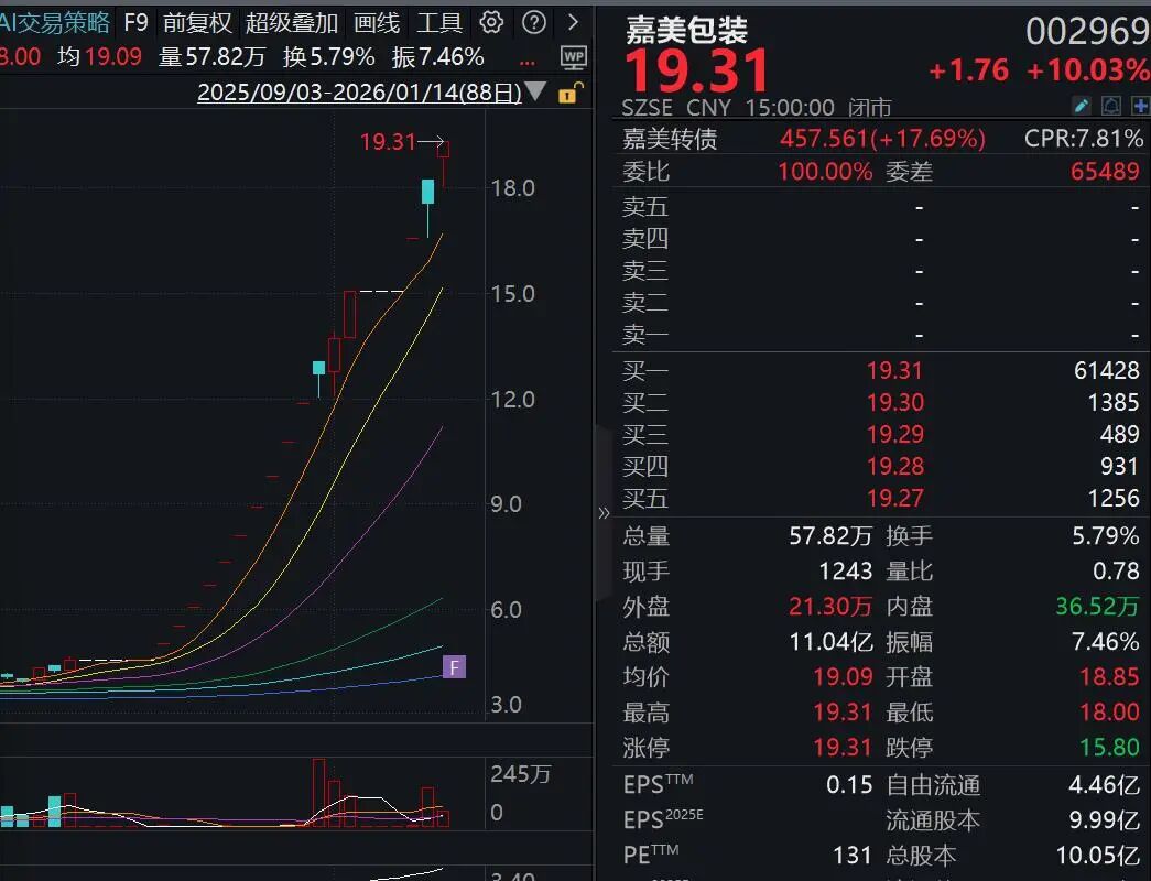 与业绩下滑形成鲜明对比的是,嘉美包装的股价“一骑绝尘”。2026年1月14日,公司股价再度涨停,自2025年12月17日复牌以来,其累计涨幅已高达323.46%。
