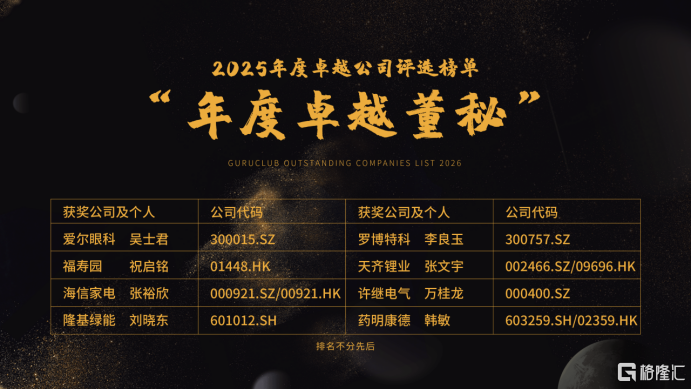 12月22日,格隆汇在线上举办"科技赋能·资本破局"分享会。本次分享会,备受瞩目的卓越公司评选榜单将隆重揭晓,其中格隆汇“金格奖”年度卓越公司评选中,爱尔眼科(300015.SZ)吴士君、福寿园(01448.HK)祝启铭、海信家电(000921.SZ/00921.HK)张裕欣、隆基绿能(601012.SH)刘晓东、罗博特科(300757.SZ)李良玉、天齐锂业(002466.SZ/09696.HK)张文宇、许继电气(000400.SZ)万桂龙、药明康德(603259.SH/02359.HK)韩敏8位荣获“年度卓越董秘”奖项。(排名不分先后,按公司首部字母顺序排列)