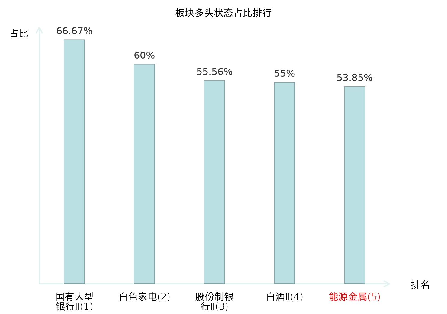 全市场所有行业板块中主力多头状态占比排名中,国有大型银行Ⅱ板块位居第一。林业Ⅱ板块名次提升最快,较昨日上升99位。