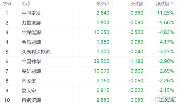 煤炭板块大跌,中国秦发跌超11%,力量发展跌超5%,金马能源、中煤能源跌超4%,久泰邦达能源跌超3%。