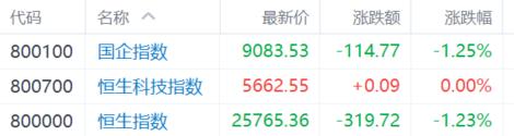 12月8日,港股恒生指数、国企指数全天呈单边下跌行情,分别收跌1.23%及1.25%,恒指再失26000点大关,恒生科技指数基本平收。