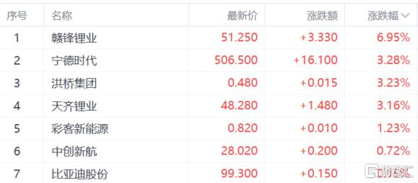 锂电池板块上涨,赣锋锂业涨近7%,洪桥集团、宁德时代、天齐锂业涨超3%。