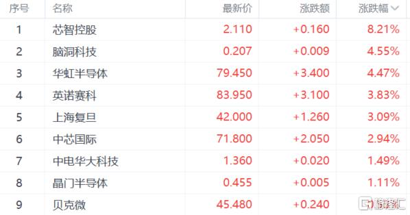 半导体板块继续走高,芯智控股涨超8%,华虹半导体、脑洞科技涨超4%,英诺赛科、上海复旦涨超3%。