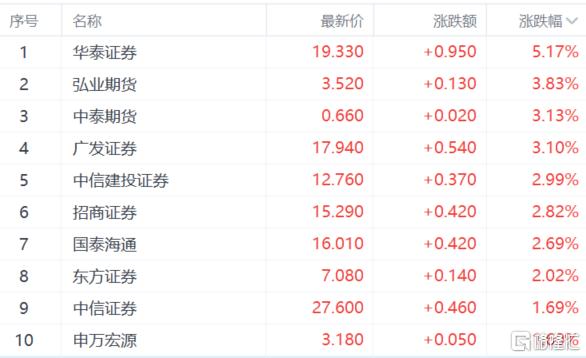 中资券商集体上涨,华泰证券涨超5%,广发证券涨超3%,国泰海通、中信建投证券、招商证券涨超2%。