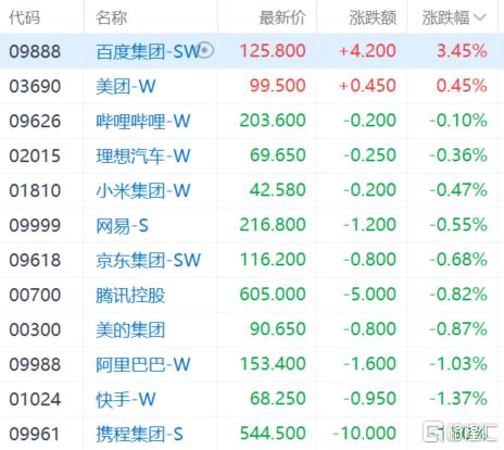 大型科技股多数呈现下跌行情但总体跌幅较小,腾讯、京东、网易、小米、京东跌幅在1%以内,阿里巴巴、快手、携程控股跌超1%,百度逆市大涨3.45%。