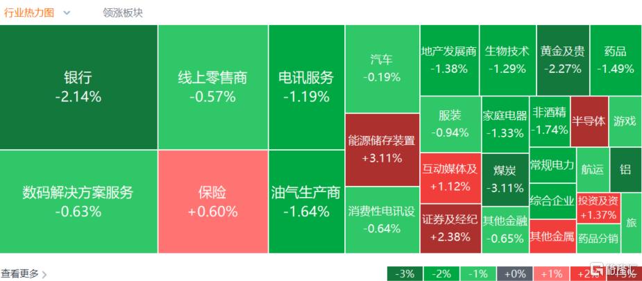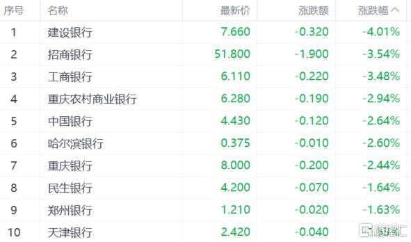 内地银行股普跌,建设银行跌超4%,工商银行、招商银行跌超3%,中国银行跌超2%。