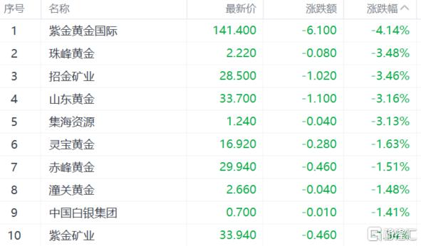 黄金股走低,紫金黄金国际跌超4%,珠峰黄金、招金矿业、山东黄金跌超3%。