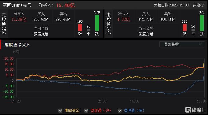 今日,南向资金净买入15.40亿港元,其中港股通(沪)净买入11.08亿港元,港股通(深)净买入4.32亿港元。