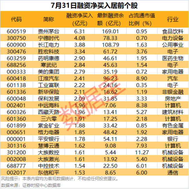 具体到个股,7月31日获融资净买入千万元以上的有527只,其中40只融资净买入额超亿元。贵州茅台融资净买入额居首,当日净买入6.31亿元;其次是宁德时代、长江电力,融资净买入金额分别为4.08亿元、3.88亿元,融资净买入金额居前的还有胜宏科技、药明康德、寒武纪等。