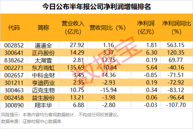 统计显示,今日共9家公司发布半年报,按净利润增幅统计,道道全、正丹股份、太湖雪上半年净利润同比分别增长563.15%、120.35%、69.77%。