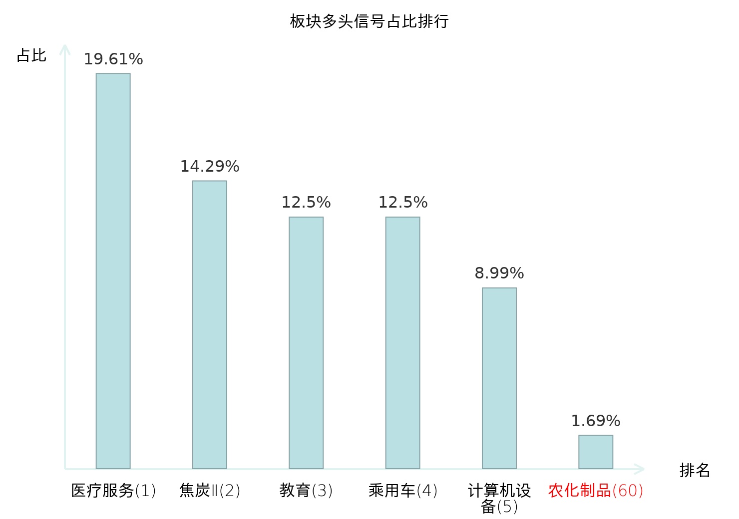 全市场所有行业板块中主力多头信号占比排名中,医疗服务板块位居第一。焦炭Ⅱ板块名次提升最快,较昨日上升119位。