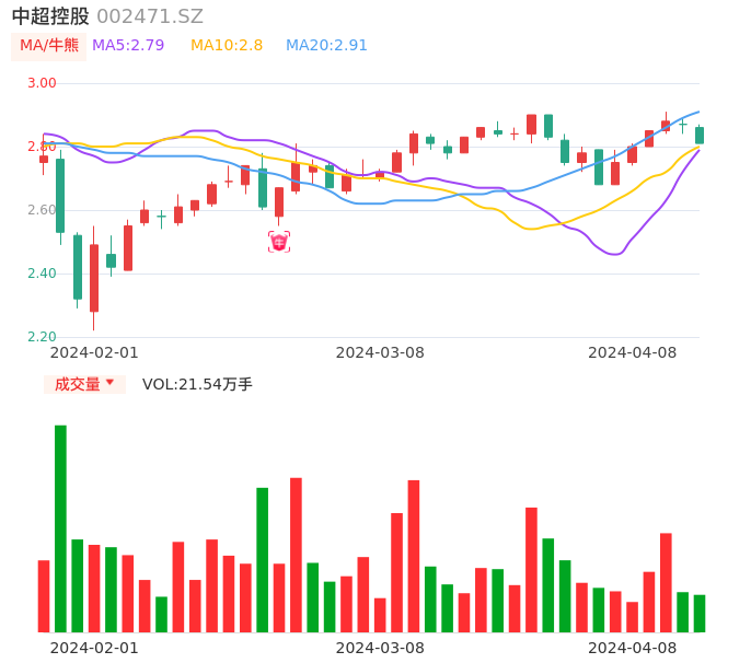 04月08日,中超控股收报2.81,股价涨幅-2.09%,成交金额6119.77万元,换手率1.70%。