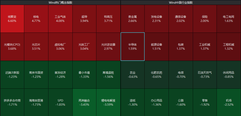 具体来看,可控核聚变概念爆发,中国核建、国机重装等涨停。商业航天延续强势,超捷股份、航天动力等涨停。电网设备板块走强,中国西电、中能电气等涨停。下跌方面,零售板块调整,茂业商业、中央商场、永辉超市跌停。