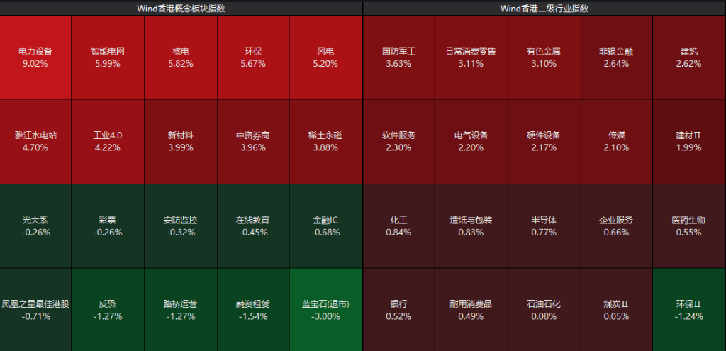 港股震荡走强,截至收盘,恒指涨1.75%,恒生科技指数涨1.87%。大型科技股集体上涨助力大市上行,腾讯、小米、阿里巴巴、百度均涨超2%;大金融股全线上涨,香港本地股银行股渣打集团、汇丰控股皆刷新历史新高,汇丰市值站上2万亿港元;有色金属板块再度活跃,风电股继续强势行情。另一方面,药品股多数走低。