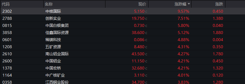 中核国际涨幅超9%,创新实业涨超7%,中国白银集团、中国铝业跟涨。