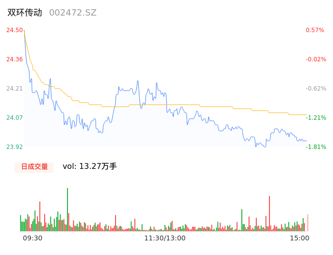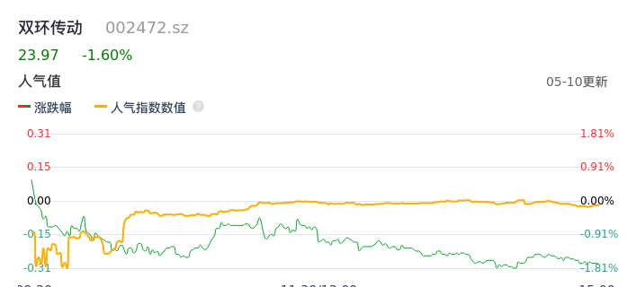 05月10日,双环传动收报23.97,股价涨幅-1.60%,成交金额3.20亿元,换手率1.75%。