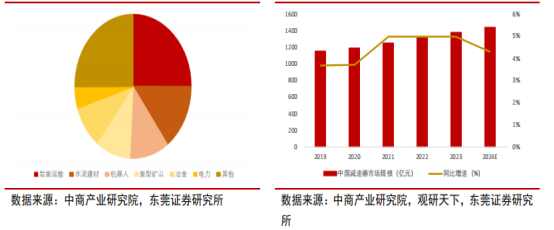 图表3:减速器下游应用领域占比(%)(左)中国减速器市场规模及增速(亿元,%)(右)