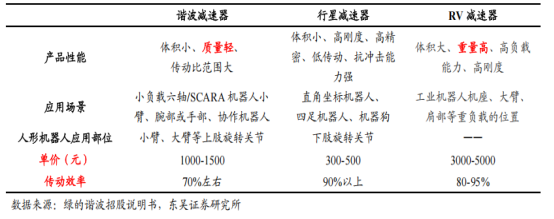 图表1:谐波减速机、行星减速机和RV减速机性能及应用对比