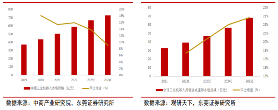 图表2:中国工业机器人市场规模及增速(亿元,%)(左)全球工业机器人用谐波减速器市场规模及增速(亿元,%)(右)