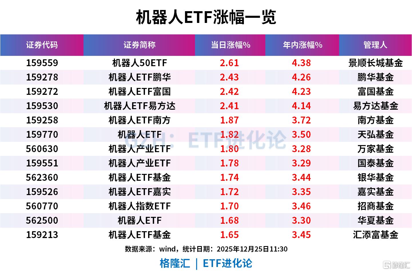 机器人板块上涨,昊志机电、拓斯达、埃夫特-U涨超10%,带动机器人50ETF、机器人ETF鹏华、机器人ETF富国、机器人ETF易方达涨超2%;机器人ETF南方、机器人ETF、机器人产业ETF、机器人产业ETF、机器人ETF基金、机器人ETF嘉实、机器人指数ETF、机器人ETF、机器人ETF基金上涨。