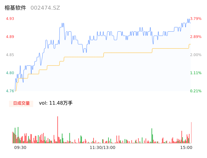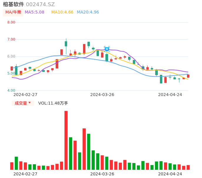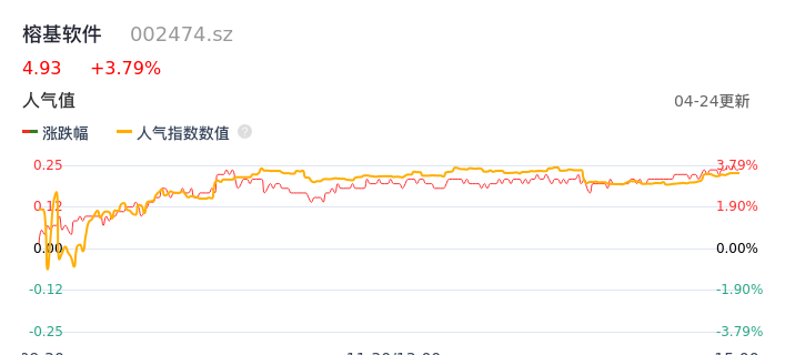 04月24日,榕基软件收报4.93,股价涨幅3.79%,成交金额5589.47万元,换手率2.17%。