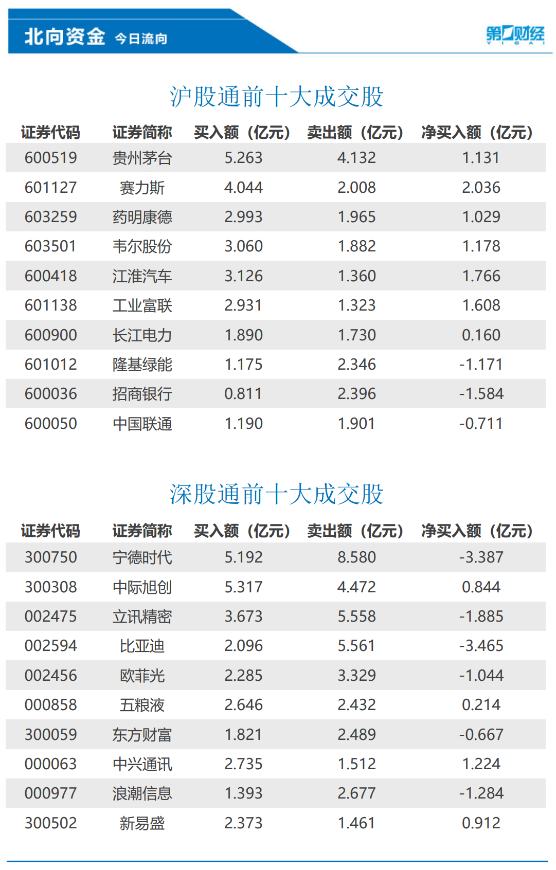 前十大成交股中,净买入额居前三的是赛力斯、江淮汽车、工业富联,分别获净买入2.04亿元、1.77亿元、1.61亿元。