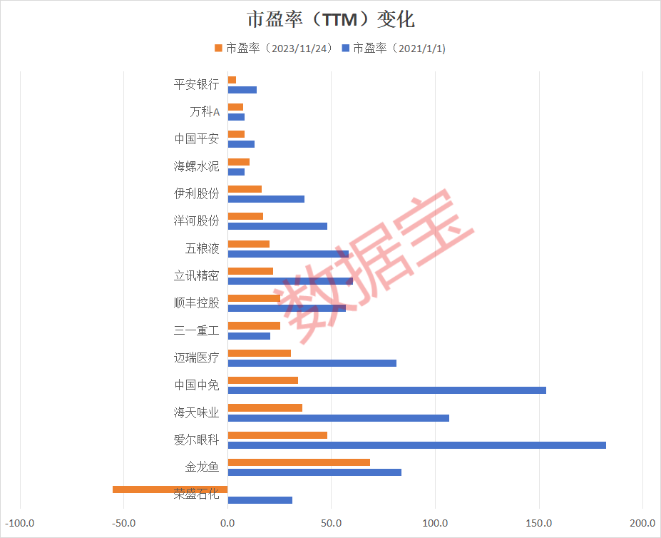 数据宝统计显示,上述连续三年下跌白马股中,68.8%的公司最新市盈率较2021年初降幅超三成,其中中国中免、爱尔眼科市盈率降幅最为明显,分别从2021年初的153.3倍、182.2倍降至当前的33.9倍、47.9倍;平安银行、中国平安市盈率从双位数降至个位数,分别从2021年初的13.9倍、12.9倍降至当前的4倍和8.2倍。