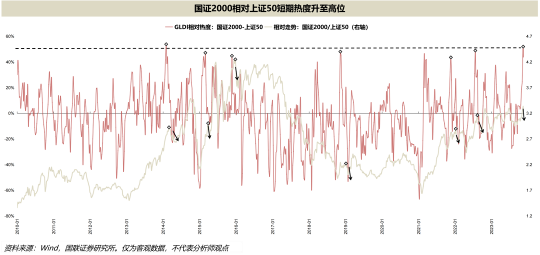 10月24日沪指反弹以来,白马股表现显著弱于成长股。代表沪深北交易所小型股票走势的国证2000指数10月24以来累计涨幅达10.5%,显著高于代表龙头企业整体走势的上证50,其涨幅仅为0.9%。据国联证券数据,截至11月23日,大小盘热度(国证2000指数与上证50指数成份股中,收盘价高于过去30天均价的成份股比例之差)达到50%,已接近2010年以来的历史极值54%。