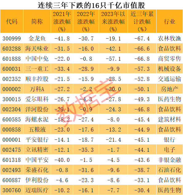 证券时报·数据宝统计,截至11月24日(下同)金龙鱼、海天味业、中国中免等16股近三年连续下跌,股价累计跌幅均超三成,主要有以下原因: