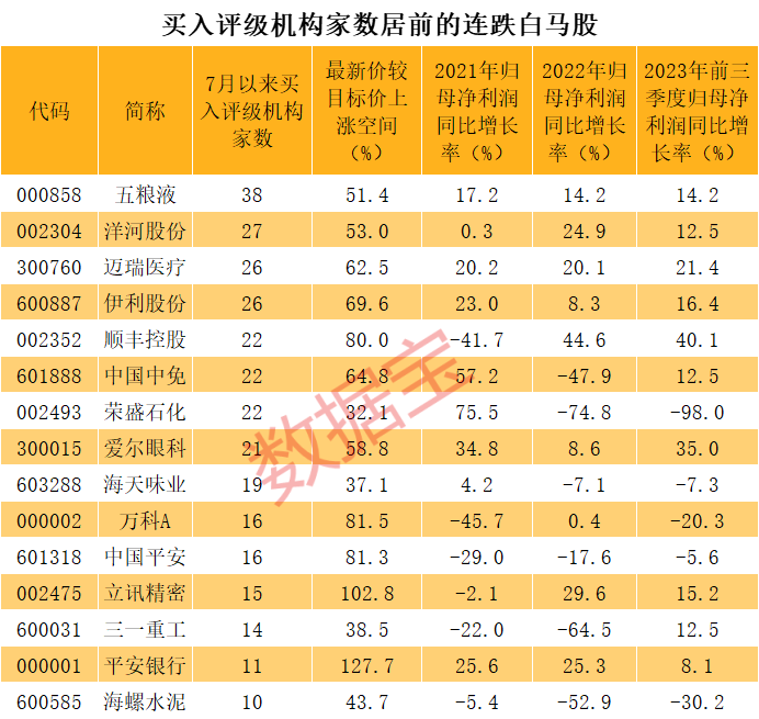 数据宝统计显示,从机构关注度来看,今年下半年以来,上述16股均获机构买入评级,五粮液、洋河股份、迈瑞医疗、伊利股份被25家以上机构给予买入评级。其中五粮液被安信证券、华泰证券、东方证券等38家机构发布的研报出具买入评级,安信证券认为公司作为浓香龙头,当前估值较低,目标价为232元,较最新收盘上涨空间超五成。
