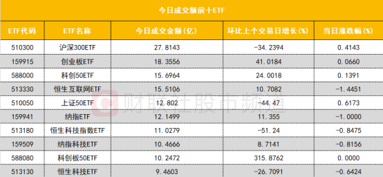 从成交额前十的ETF来看,沪深300ETF(510300)成交额位居首位,创业板ETF(159915)和科创50ETF(588000)分居二、三位。