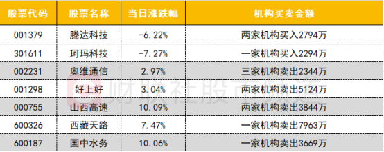 卖出方面,华为海思概念股好上好遭机构卖出超5000万;上演准“地天板”的基建股西藏天路遭机构卖出近8000万。