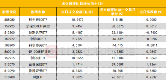 从成交额环比增长前十的ETF来看,科创50ETF(588000)成交额环比增长315%位居首位;沪深300ETF南方(159925)成交额环比增长88%位居次席。