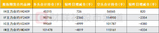 四大期指主力合约中,IF、IC、IM合约多空双方均大幅减仓,IF合约多空双方减仓数量相当,IC、IM合约多头减仓数量较多;IH合约多空双方均小幅加仓,空头加仓数量略多。