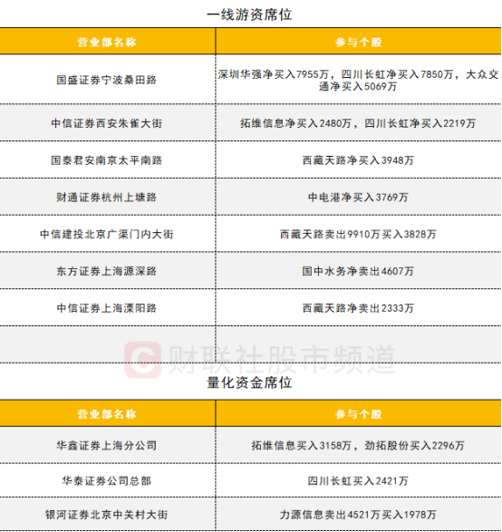 一线游资活跃度有所提升,华为海思概念股四川长虹获两家一线游资席位买入;西藏天路获一家游资席位买入、一家游资席位卖出、一家游资席位做T;大众交通获国盛证券宁波桑田路营业部买入超5000万。