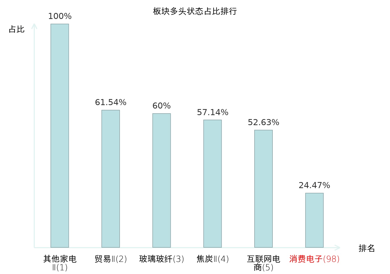 全市场所有行业板块中主力多头状态占比排名中,其他家电Ⅱ板块位居第一。教育板块名次提升最快,较昨日上升50位。