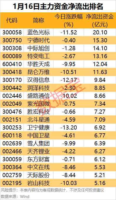 据数据宝统计,逾200股主力资金净流出均超1亿元,其中6股净流出金额均超11亿元。