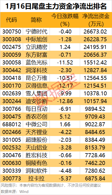 此外,还有中际旭创、立讯精密、东方财富、蓝色光标和润泽科技等热门股尾盘主力资金净流出金额居前。